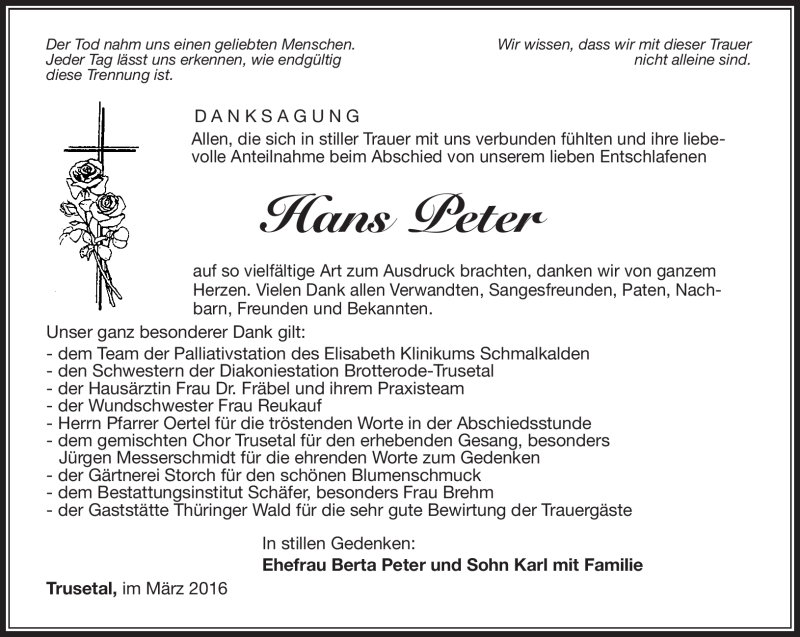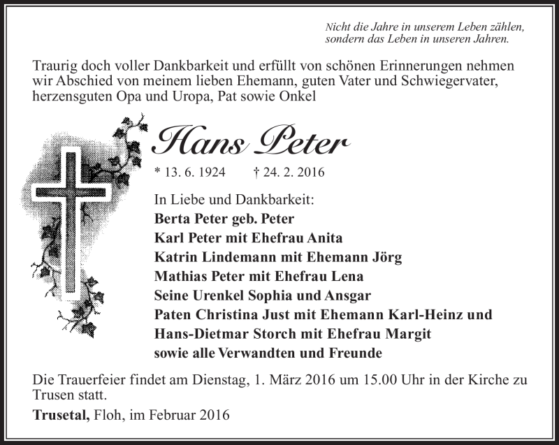 Hier finden Sie alle Traueranzeigen aus der Zeitung, die bisher für Hans Peter erschienen sind. Weitere Traueranzeigen, die in der Zeitung erscheinen, werden hier ebenfalls aufgelistet