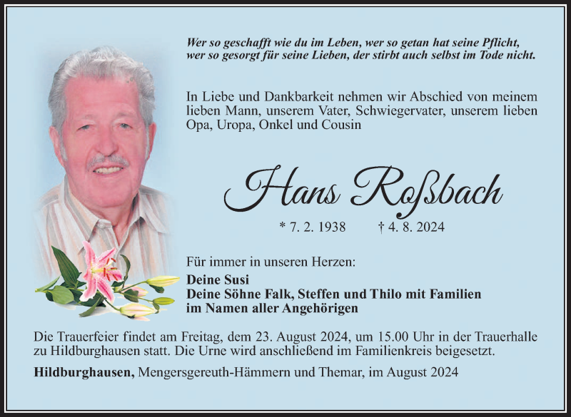 Hier finden Sie alle Traueranzeigen aus der Zeitung, die bisher für Hans Roßbach erschienen sind. Weitere Traueranzeigen, die in der Zeitung erscheinen, werden hier ebenfalls aufgelistet