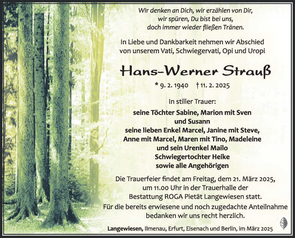 Hier finden Sie alle Traueranzeigen aus der Zeitung, die bisher für Hans-Werner Strauß erschienen sind. Weitere Traueranzeigen, die in der Zeitung erscheinen, werden hier ebenfalls aufgelistet