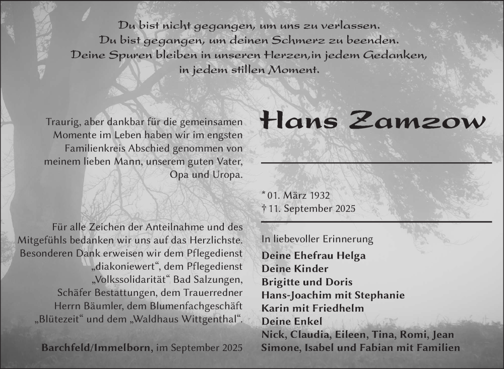 Hier finden Sie alle Traueranzeigen aus der Zeitung, die bisher für Hans Zamzow erschienen sind. Weitere Traueranzeigen, die in der Zeitung erscheinen, werden hier ebenfalls aufgelistet