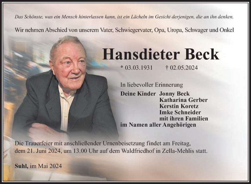 Hier finden Sie alle Traueranzeigen aus der Zeitung, die bisher für Hansdieter Beck erschienen sind. Weitere Traueranzeigen, die in der Zeitung erscheinen, werden hier ebenfalls aufgelistet