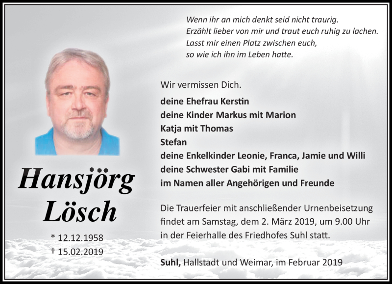 Hier finden Sie alle Traueranzeigen aus der Zeitung, die bisher für Hansjörg Lösch erschienen sind. Weitere Traueranzeigen, die in der Zeitung erscheinen, werden hier ebenfalls aufgelistet