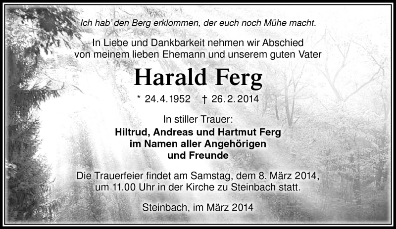 Hier finden Sie alle Traueranzeigen aus der Zeitung, die bisher für Harald Ferg erschienen sind. Weitere Traueranzeigen, die in der Zeitung erscheinen, werden hier ebenfalls aufgelistet