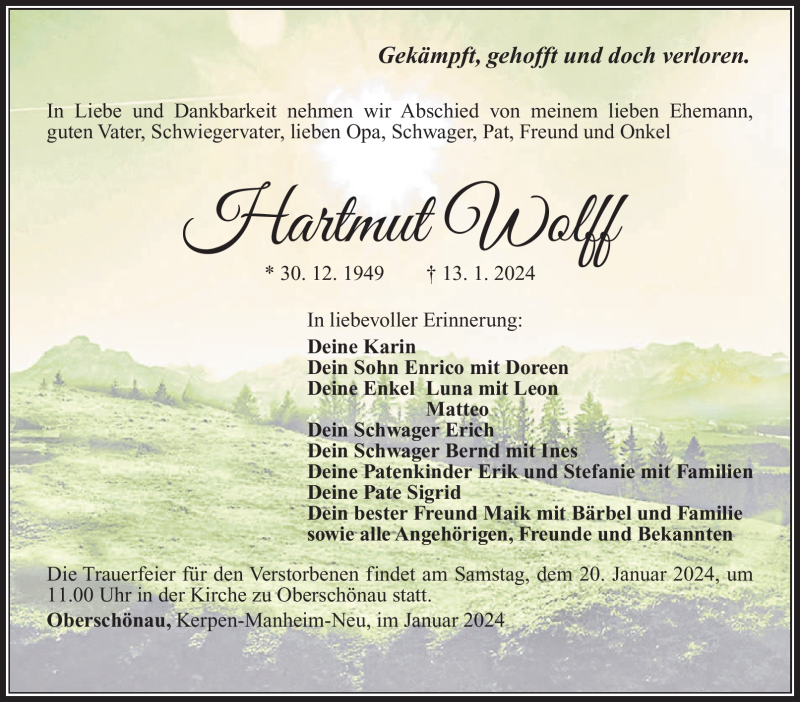 Hier finden Sie alle Traueranzeigen aus der Zeitung, die bisher für Harmtu Wolff erschienen sind. Weitere Traueranzeigen, die in der Zeitung erscheinen, werden hier ebenfalls aufgelistet