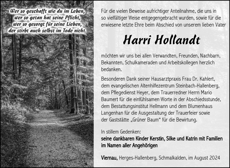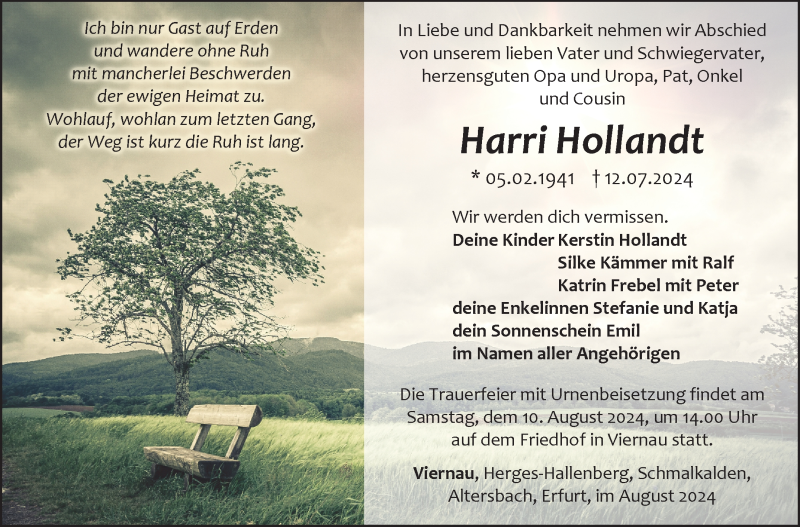 Hier finden Sie alle Traueranzeigen aus der Zeitung, die bisher für Harri Hollandt erschienen sind. Weitere Traueranzeigen, die in der Zeitung erscheinen, werden hier ebenfalls aufgelistet