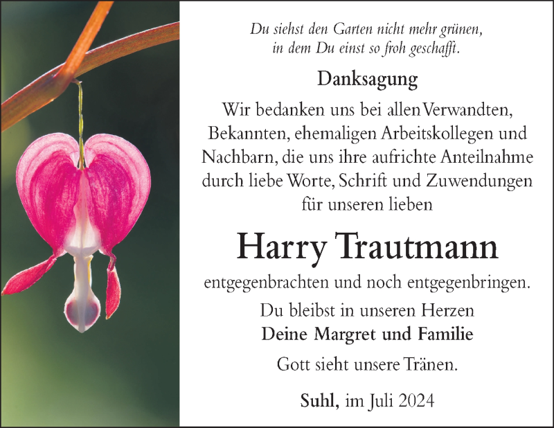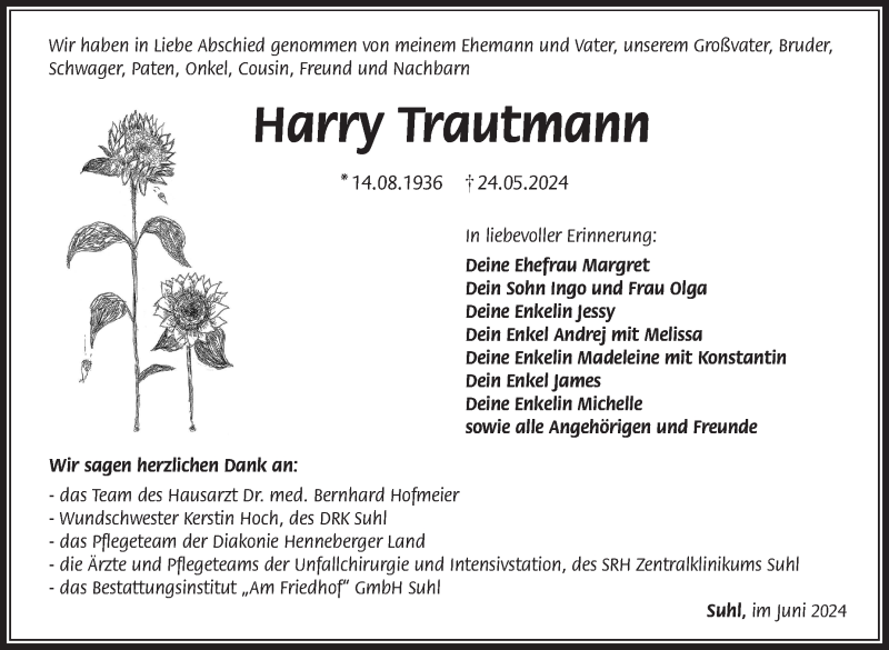 Hier finden Sie alle Traueranzeigen aus der Zeitung, die bisher für Harry Trautmann erschienen sind. Weitere Traueranzeigen, die in der Zeitung erscheinen, werden hier ebenfalls aufgelistet