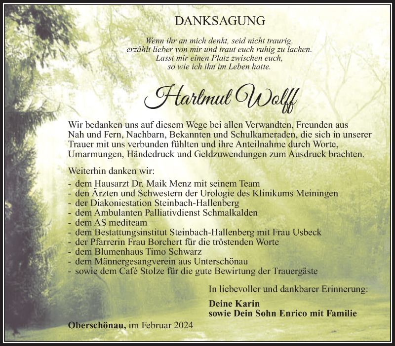 Hier finden Sie alle Traueranzeigen aus der Zeitung, die bisher für Hartmut Wolff erschienen sind. Weitere Traueranzeigen, die in der Zeitung erscheinen, werden hier ebenfalls aufgelistet