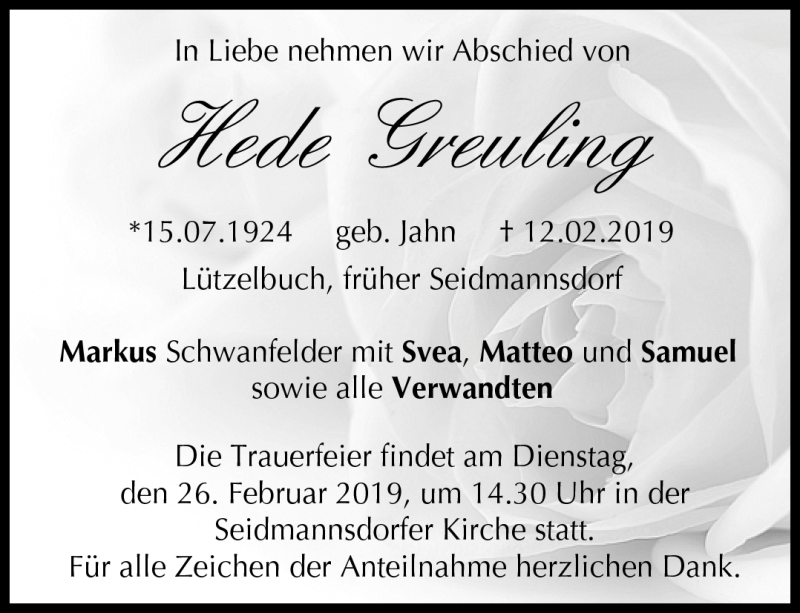 Hier finden Sie alle Traueranzeigen aus der Zeitung, die bisher für Hede Greuling erschienen sind. Weitere Traueranzeigen, die in der Zeitung erscheinen, werden hier ebenfalls aufgelistet