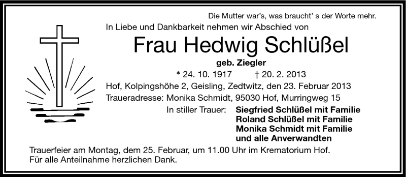 Hier finden Sie alle Traueranzeigen aus der Zeitung, die bisher für Hedwig Schlüßel erschienen sind. Weitere Traueranzeigen, die in der Zeitung erscheinen, werden hier ebenfalls aufgelistet