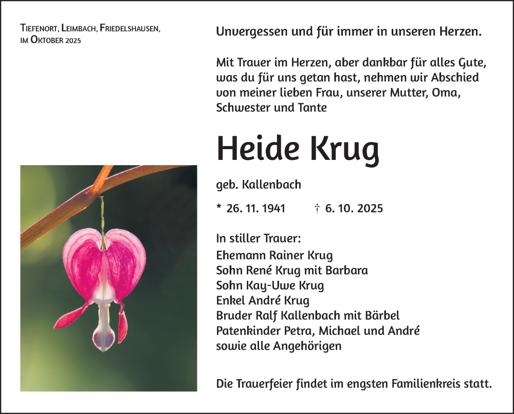 Hier finden Sie alle Traueranzeigen aus der Zeitung, die bisher für Heide Krug erschienen sind. Weitere Traueranzeigen, die in der Zeitung erscheinen, werden hier ebenfalls aufgelistet