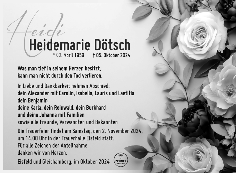 Hier finden Sie alle Traueranzeigen aus der Zeitung, die bisher für Heidemarie Dötsch erschienen sind. Weitere Traueranzeigen, die in der Zeitung erscheinen, werden hier ebenfalls aufgelistet