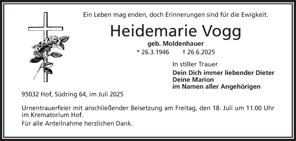 Hier finden Sie alle Traueranzeigen aus der Zeitung, die bisher für Heidemarie Vogg erschienen sind. Weitere Traueranzeigen, die in der Zeitung erscheinen, werden hier ebenfalls aufgelistet