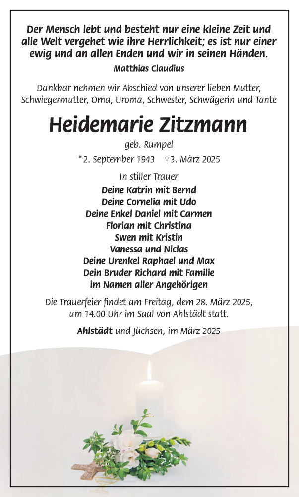 Hier finden Sie alle Traueranzeigen aus der Zeitung, die bisher für Heidemarie Zitzmann erschienen sind. Weitere Traueranzeigen, die in der Zeitung erscheinen, werden hier ebenfalls aufgelistet
