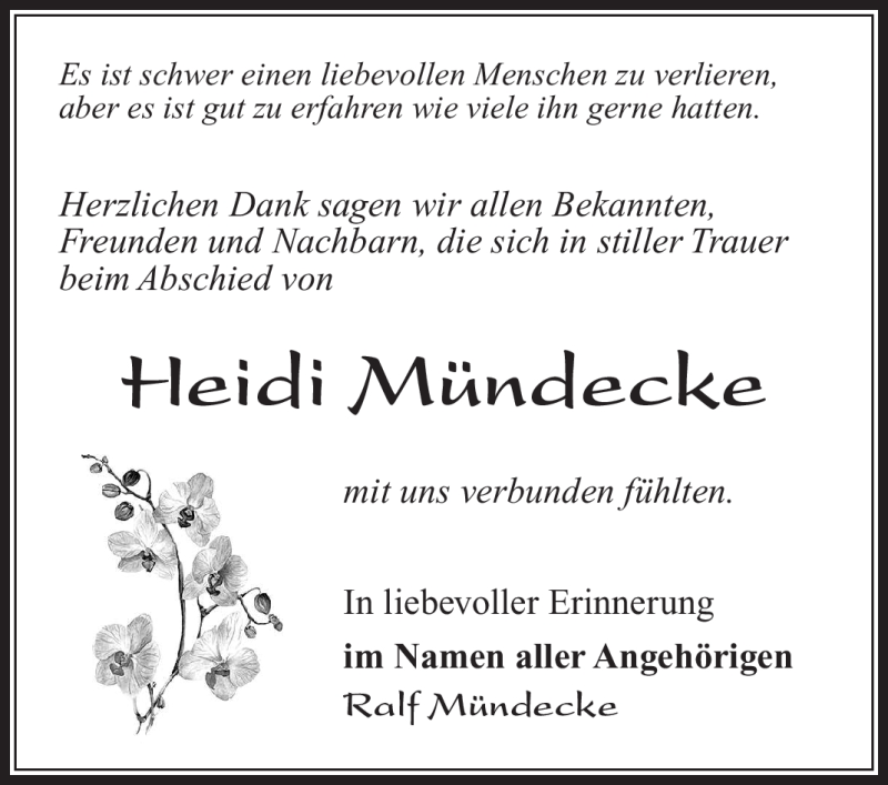 Hier finden Sie alle Traueranzeigen aus der Zeitung, die bisher für Heidi Mündecke erschienen sind. Weitere Traueranzeigen, die in der Zeitung erscheinen, werden hier ebenfalls aufgelistet