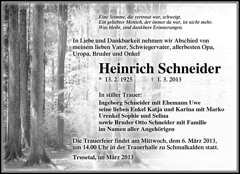 Hier finden Sie alle Traueranzeigen aus der Zeitung, die bisher für Heinrich Schneider erschienen sind. Weitere Traueranzeigen, die in der Zeitung erscheinen, werden hier ebenfalls aufgelistet