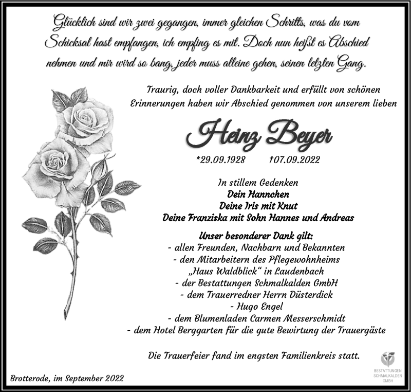 Hier finden Sie alle Traueranzeigen aus der Zeitung, die bisher für Heinz Beyer erschienen sind. Weitere Traueranzeigen, die in der Zeitung erscheinen, werden hier ebenfalls aufgelistet