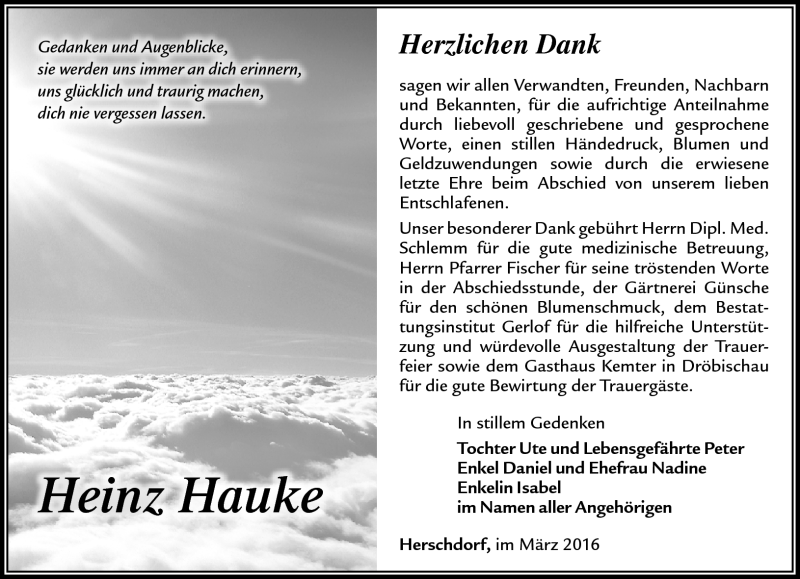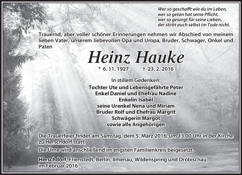 Hier finden Sie alle Traueranzeigen aus der Zeitung, die bisher für Heinz Hauke erschienen sind. Weitere Traueranzeigen, die in der Zeitung erscheinen, werden hier ebenfalls aufgelistet