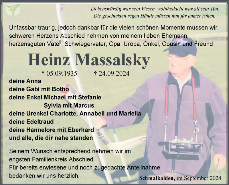 Hier finden Sie alle Traueranzeigen aus der Zeitung, die bisher für Heinz Massalsky erschienen sind. Weitere Traueranzeigen, die in der Zeitung erscheinen, werden hier ebenfalls aufgelistet