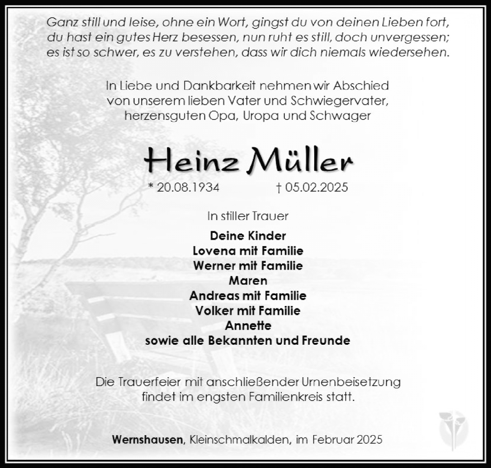 Hier finden Sie alle Traueranzeigen aus der Zeitung, die bisher für Heinz Müller erschienen sind. Weitere Traueranzeigen, die in der Zeitung erscheinen, werden hier ebenfalls aufgelistet