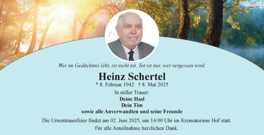 Hier finden Sie alle Traueranzeigen aus der Zeitung, die bisher für Heinz Schertel erschienen sind. Weitere Traueranzeigen, die in der Zeitung erscheinen, werden hier ebenfalls aufgelistet
