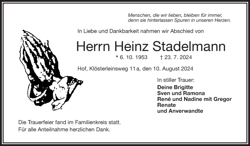Hier finden Sie alle Traueranzeigen aus der Zeitung, die bisher für Heinz Stadelmann erschienen sind. Weitere Traueranzeigen, die in der Zeitung erscheinen, werden hier ebenfalls aufgelistet