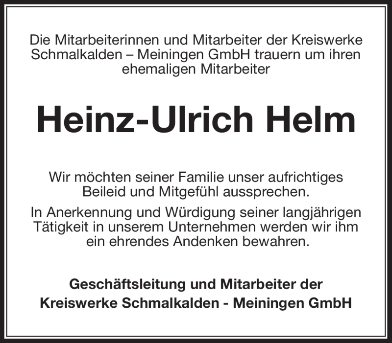 Hier finden Sie alle Traueranzeigen aus der Zeitung, die bisher für Heinz-Ulrich Helm erschienen sind. Weitere Traueranzeigen, die in der Zeitung erscheinen, werden hier ebenfalls aufgelistet