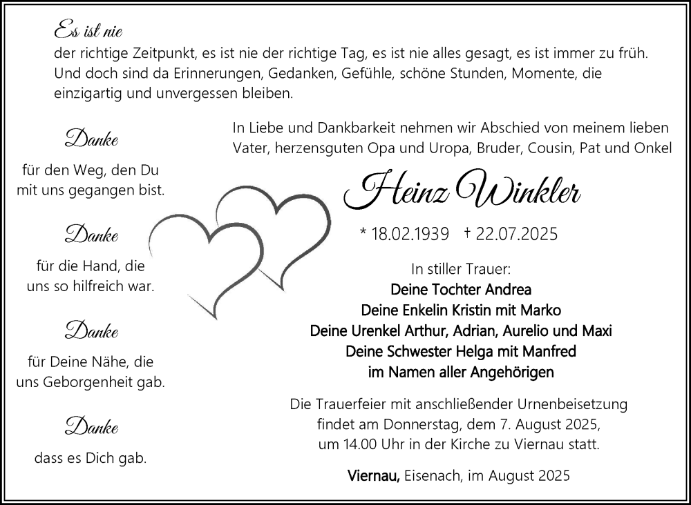 Hier finden Sie alle Traueranzeigen aus der Zeitung, die bisher für Heinz Winkler erschienen sind. Weitere Traueranzeigen, die in der Zeitung erscheinen, werden hier ebenfalls aufgelistet