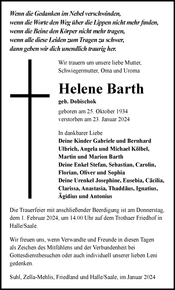 Hier finden Sie alle Traueranzeigen aus der Zeitung, die bisher für Helene Barth erschienen sind. Weitere Traueranzeigen, die in der Zeitung erscheinen, werden hier ebenfalls aufgelistet