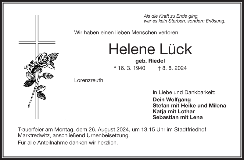 Hier finden Sie alle Traueranzeigen aus der Zeitung, die bisher für Helene Lück erschienen sind. Weitere Traueranzeigen, die in der Zeitung erscheinen, werden hier ebenfalls aufgelistet
