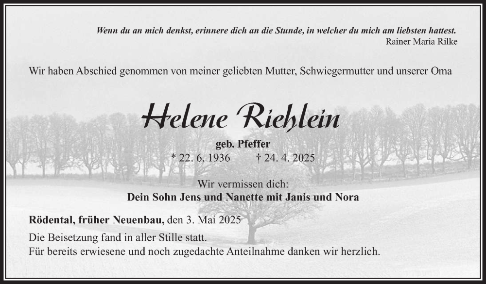Hier finden Sie alle Traueranzeigen aus der Zeitung, die bisher für Helene Riehlein erschienen sind. Weitere Traueranzeigen, die in der Zeitung erscheinen, werden hier ebenfalls aufgelistet