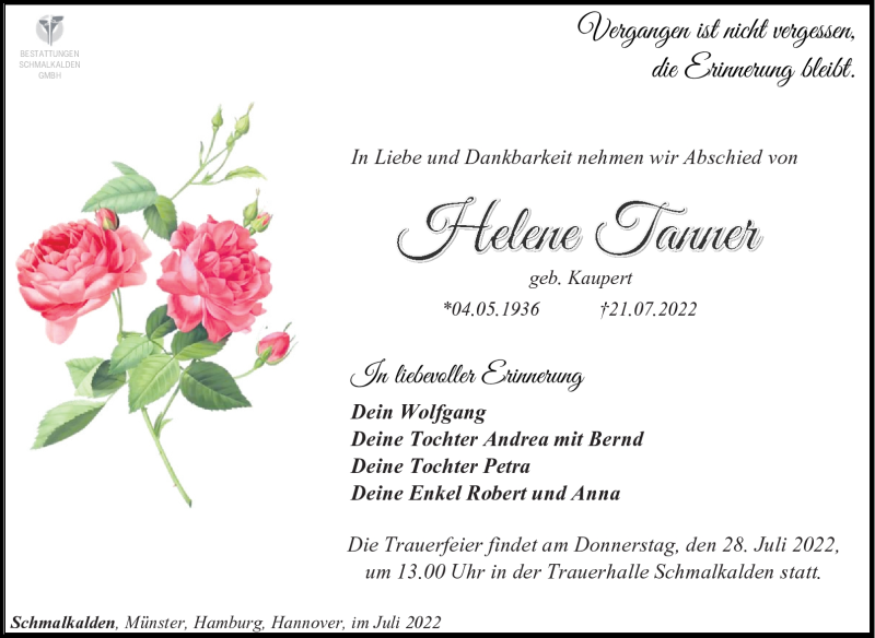 Hier finden Sie alle Traueranzeigen aus der Zeitung, die bisher für Helene Tanner erschienen sind. Weitere Traueranzeigen, die in der Zeitung erscheinen, werden hier ebenfalls aufgelistet
