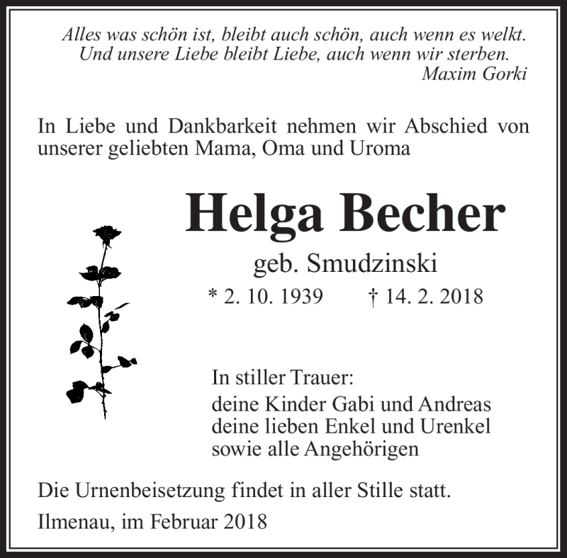 Hier finden Sie alle Traueranzeigen aus der Zeitung, die bisher für Helga Becher erschienen sind. Weitere Traueranzeigen, die in der Zeitung erscheinen, werden hier ebenfalls aufgelistet