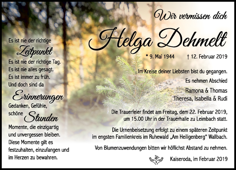 Hier finden Sie alle Traueranzeigen aus der Zeitung, die bisher für Helga Dehmelt erschienen sind. Weitere Traueranzeigen, die in der Zeitung erscheinen, werden hier ebenfalls aufgelistet