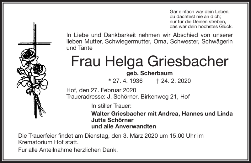 Hier finden Sie alle Traueranzeigen aus der Zeitung, die bisher für Helga Griesbacher erschienen sind. Weitere Traueranzeigen, die in der Zeitung erscheinen, werden hier ebenfalls aufgelistet
