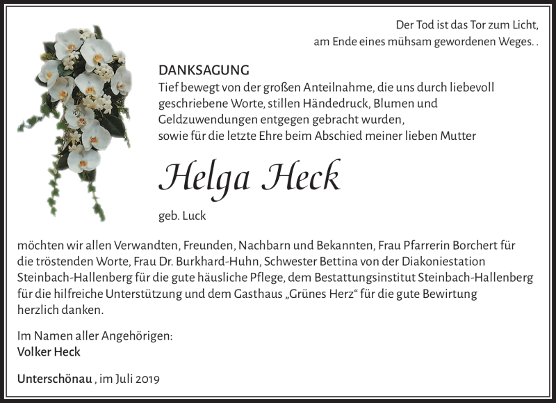 Hier finden Sie alle Traueranzeigen aus der Zeitung, die bisher für Helga Heck erschienen sind. Weitere Traueranzeigen, die in der Zeitung erscheinen, werden hier ebenfalls aufgelistet