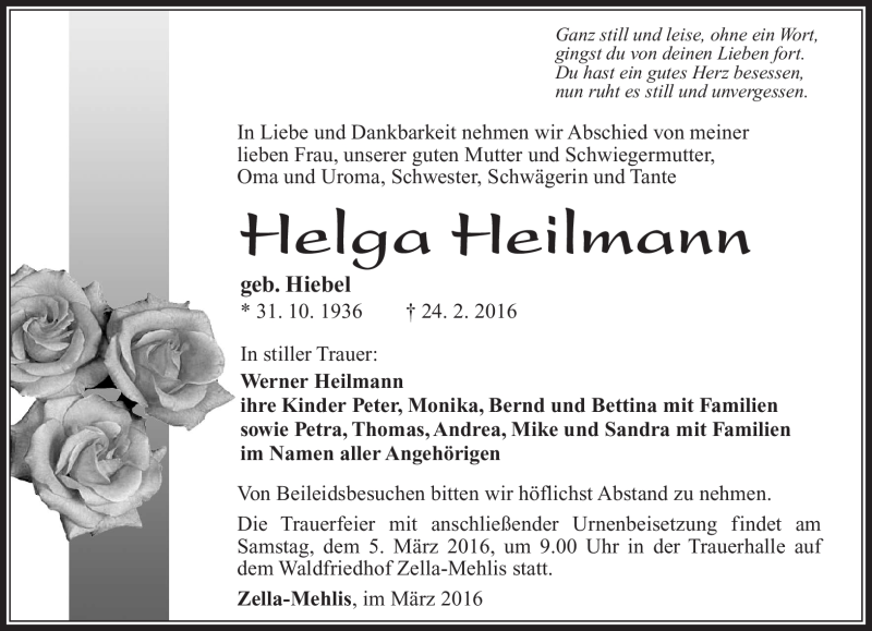 Hier finden Sie alle Traueranzeigen aus der Zeitung, die bisher für Helga Heilmann erschienen sind. Weitere Traueranzeigen, die in der Zeitung erscheinen, werden hier ebenfalls aufgelistet