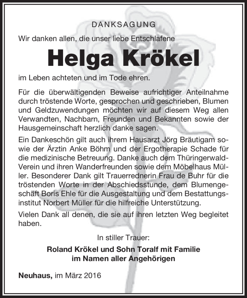 Hier finden Sie alle Traueranzeigen aus der Zeitung, die bisher für Helga Krökel erschienen sind. Weitere Traueranzeigen, die in der Zeitung erscheinen, werden hier ebenfalls aufgelistet