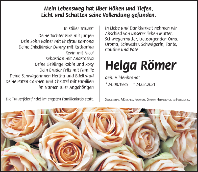 Hier finden Sie alle Traueranzeigen aus der Zeitung, die bisher für Helga Römer erschienen sind. Weitere Traueranzeigen, die in der Zeitung erscheinen, werden hier ebenfalls aufgelistet