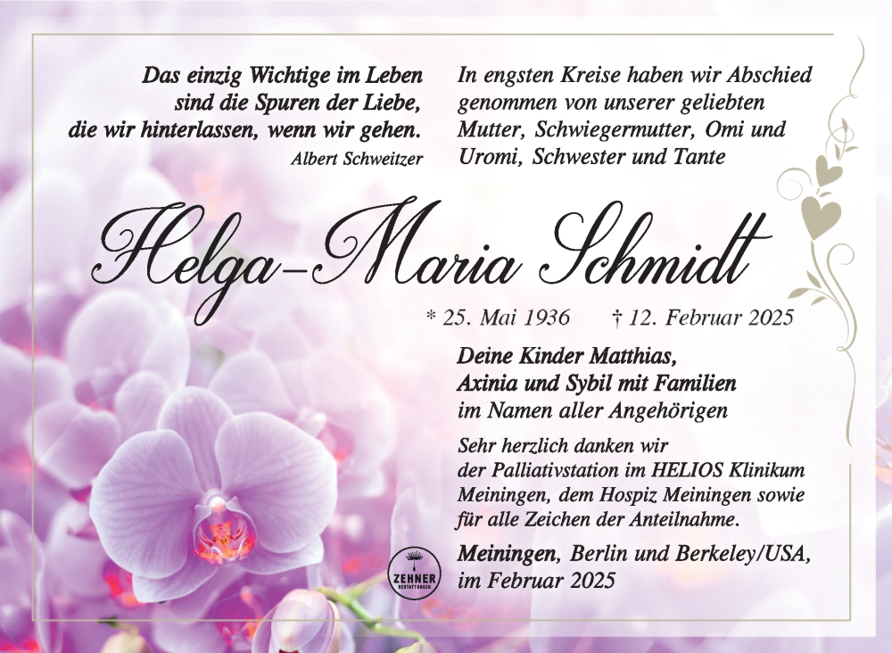 Hier finden Sie alle Traueranzeigen aus der Zeitung, die bisher für Helga-Maria Schmidt erschienen sind. Weitere Traueranzeigen, die in der Zeitung erscheinen, werden hier ebenfalls aufgelistet
