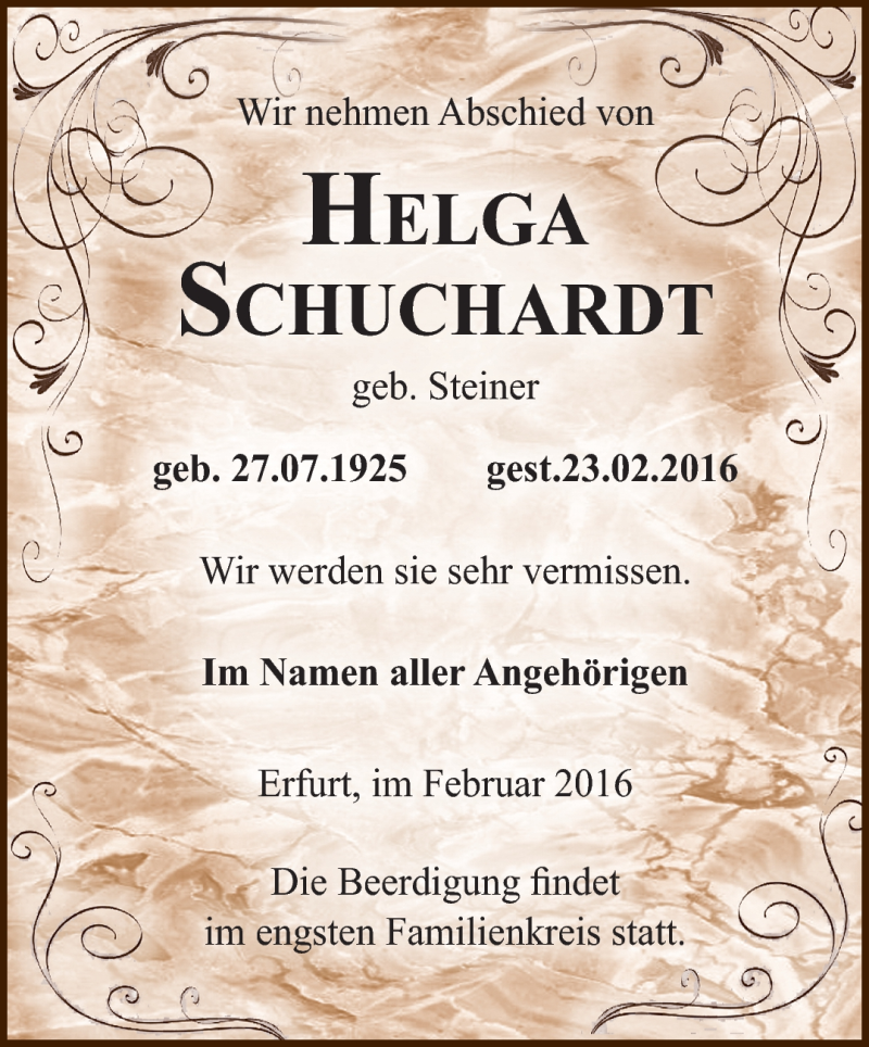 Hier finden Sie alle Traueranzeigen aus der Zeitung, die bisher für Helga Schuchardt erschienen sind. Weitere Traueranzeigen, die in der Zeitung erscheinen, werden hier ebenfalls aufgelistet