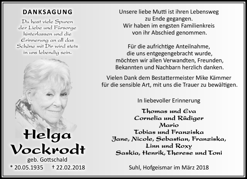 Hier finden Sie alle Traueranzeigen aus der Zeitung, die bisher für Helga Vockrodt erschienen sind. Weitere Traueranzeigen, die in der Zeitung erscheinen, werden hier ebenfalls aufgelistet