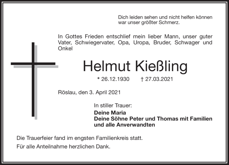 Hier finden Sie alle Traueranzeigen aus der Zeitung, die bisher für Helmut Kießling erschienen sind. Weitere Traueranzeigen, die in der Zeitung erscheinen, werden hier ebenfalls aufgelistet