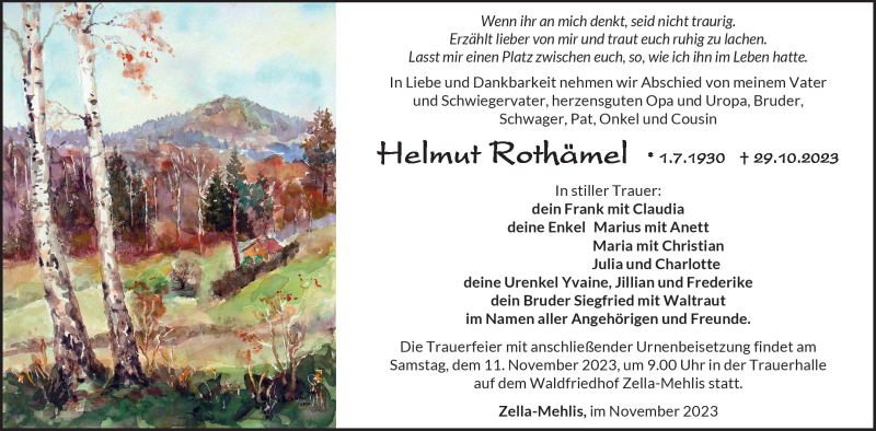 Hier finden Sie alle Traueranzeigen aus der Zeitung, die bisher für Helmut Rothämel erschienen sind. Weitere Traueranzeigen, die in der Zeitung erscheinen, werden hier ebenfalls aufgelistet