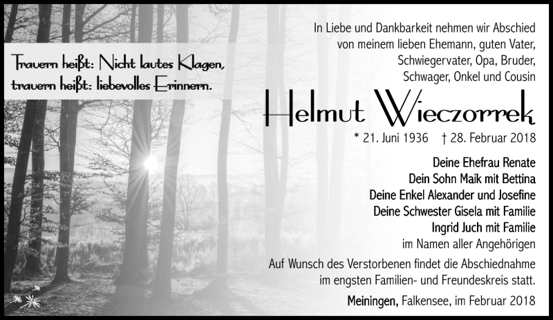 Hier finden Sie alle Traueranzeigen aus der Zeitung, die bisher für Helmut Wieczorrek erschienen sind. Weitere Traueranzeigen, die in der Zeitung erscheinen, werden hier ebenfalls aufgelistet