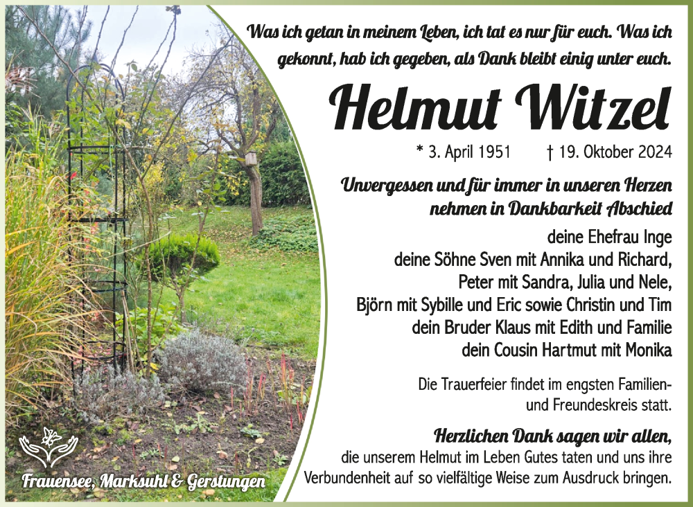 Hier finden Sie alle Traueranzeigen aus der Zeitung, die bisher für Helmut Witzel erschienen sind. Weitere Traueranzeigen, die in der Zeitung erscheinen, werden hier ebenfalls aufgelistet