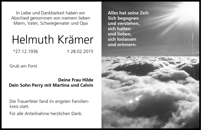 Hier finden Sie alle Traueranzeigen aus der Zeitung, die bisher für Helmuth Krämer erschienen sind. Weitere Traueranzeigen, die in der Zeitung erscheinen, werden hier ebenfalls aufgelistet
