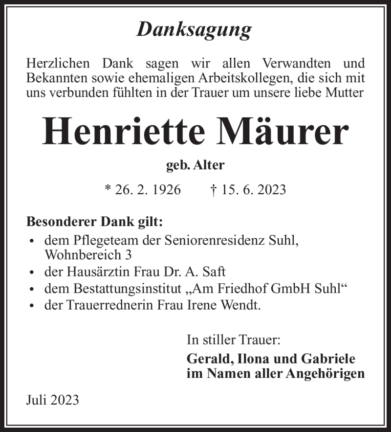 Hier finden Sie alle Traueranzeigen aus der Zeitung, die bisher für Henriette Mäurer erschienen sind. Weitere Traueranzeigen, die in der Zeitung erscheinen, werden hier ebenfalls aufgelistet