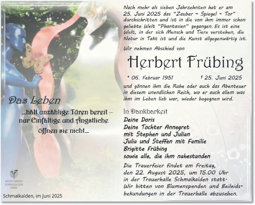 Hier finden Sie alle Traueranzeigen aus der Zeitung, die bisher für Herbert Frübing erschienen sind. Weitere Traueranzeigen, die in der Zeitung erscheinen, werden hier ebenfalls aufgelistet