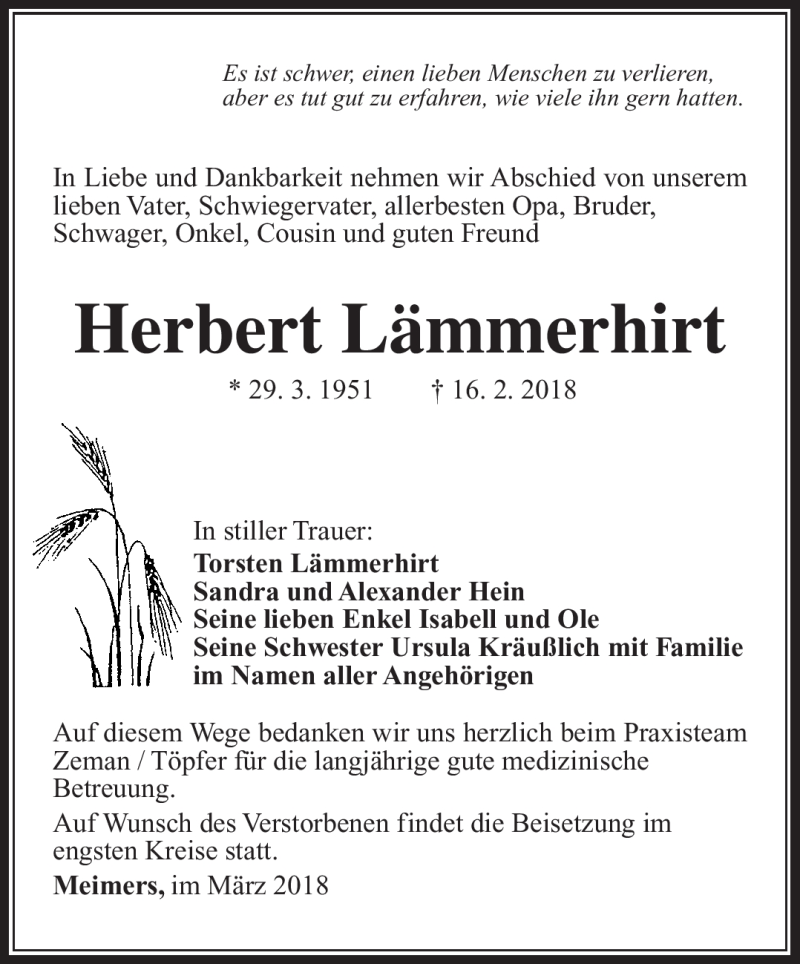 Hier finden Sie alle Traueranzeigen aus der Zeitung, die bisher für Herbert Lämmerhirt erschienen sind. Weitere Traueranzeigen, die in der Zeitung erscheinen, werden hier ebenfalls aufgelistet