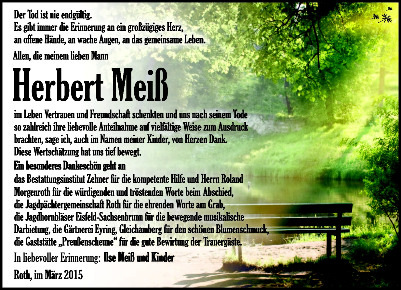 Hier finden Sie alle Traueranzeigen aus der Zeitung, die bisher für Herbert Meiß erschienen sind. Weitere Traueranzeigen, die in der Zeitung erscheinen, werden hier ebenfalls aufgelistet